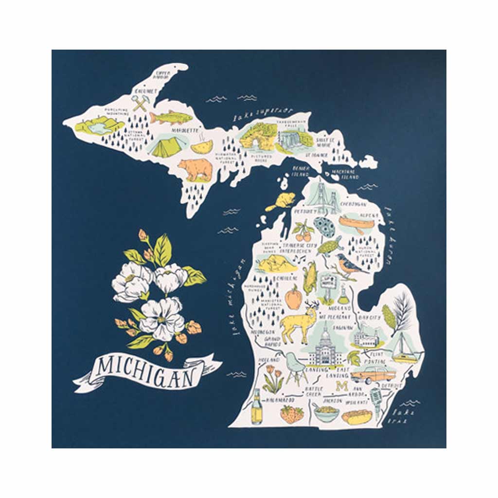 Illustrated Michigan Map Print (Silkscreened, 18 x 18) โ City Bird